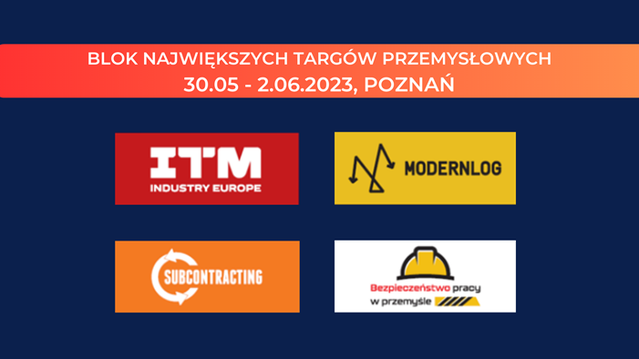 Targi Kooperacji Przemysłowej SUBCONTRACTING odbędą się w dniach 30.05-2.06.2023 na terenie Międzynarodowych Targów Poznańskich. W tym samym czasie będzie można zwiedzić ekspozycję: ITM INDUSTRY EUROPE, Targów Logistyki, Magazynowania i Transportu Modernlog oraz Salonu Bezpieczeństwa Pracy w Przemyśle.