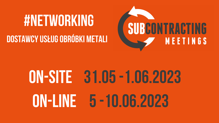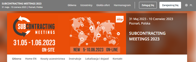 W edycji 2023 spotkania SUBCOTRACTING MEETINGS będę organizowane od 31 maja do 1 czerwca, pawilon 5 - antresola, Międzynarodowe Targi Poznańskie. Nowością jest potargowa sesja on-line 5-10.06.2023.