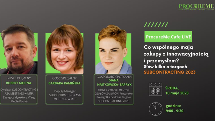 Jeśli zastanawialiście się, co nowego przygotowaliśmy na tegoroczną edycję targów Subcontracting 2023, to zapraszamy na nasze Social Media na specjalny odcinek Live z Dianą Najtkowską-Sapryk z ProcureMe już 10 maja 2023 o godz. 9.00. Diana Najtkowska-Sapryk zdradzi Wam trochę o swoim planowanym na targach wykładzie - o innowacjach w zakupach.