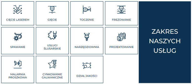 Firma METAL oferuje jedne z najpopularniejszych rozwiązań i technologii obróbki przemysłowej. Posiada maszyny wiodących producentów na świecie, co umożliwia pełną współpracę nawet z najbardziej wymagającymi Klientami. Wśród wykonywanych nas usług znajduje się: cięcie laserem, gięcie, toczenie, frezowanie, spawanie i wiele innych. Firma gwarantuje powtarzalność wykonywanych elementów, zarówno tych standardowych, jak i wykonywanych według specjalnego projektu Klienta. Zaplecze oraz park maszynowy pozwala firmie METAL na wykonywanie zarówno najmniejszych detali, jak i wielkogabarytowych elementów.