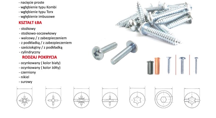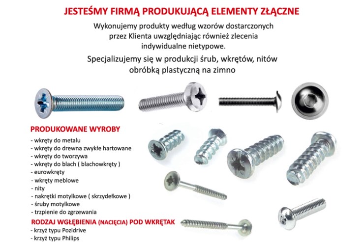 Oferta firmy to przede wszystkim produkcja wyrobów śrubowych – wkręty, nity, śruby dla meblarstwa do okuć meblowych wg norm, na zamówienie oraz wyroby niestandardowe dla innych branż przemysłu uwzględniając również zlecenia indywidualne i nietypowe. Rodzaj pokrycia to ocynkowany kolor biały , żółty, czarny, nikiel oraz surowe.